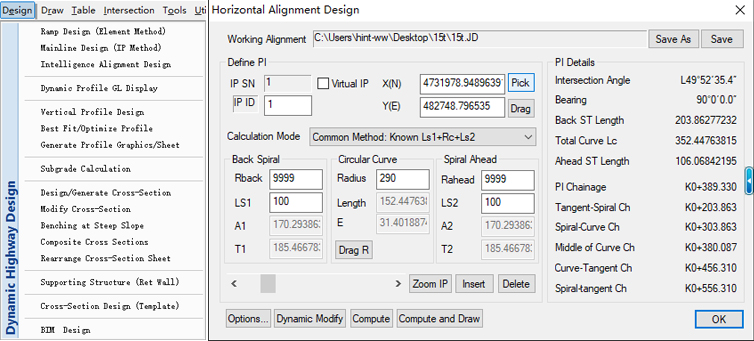 1)   提供常规路线几何设计功能,支持公路、城市道路、铁路、厂矿道路等路线平纵横几何设计与图表成果自动输出功能;
