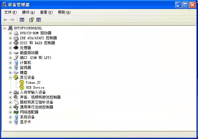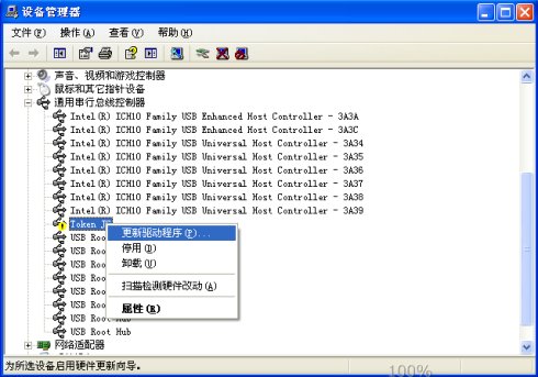 第一步:右键点击“我的电脑”打开设备管理器(或在控制面板中打开),在其他设备(或通用串行总线控制器中)中找到有Token JC(部分电脑显示为USB device),点击右键,选择更新驱动程序,如图: