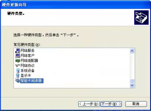第四步:在硬件类型列表中下拉,选择“智能卡阅读器”,并点击下一步,如图: