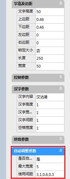 在调整模板过程中,经常会涉及到文字的修改。这时不少客户就提到,在原有模板文字的基础上增加或者减少文字时版面就会发生变化,例如文字超出版面范围、文字覆盖标志图案、版面尺寸减小或增大等,利用“文字自动调整功能”将快速解决这些问题。自动调整参数中,“最大宽度”表示无论增加或者减少文字,文字的总长度保持不变;“使用间距”表示文字个数变化时,因为最大宽度的限制,系统会根据文字个数自动套用某一间距来满足文字变化的需要,间距大小由左向右递减排列。