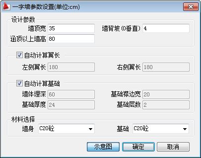 系统提供了板涵、圆管涵、拱涵、箱涵一字墙自动设计功能,程序将根据涵身参数自动将一字墙的参数设置为与涵身相对应的尺寸。如下图所示,程序可以自动计算翼墙长度和基础的各项参数。