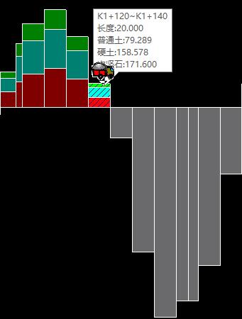 如下图1为某项目土石方纵向调配过程,将K1+120~K1+140的挖方土体调配至与其相邻的K1+140~K1+160填方段落,调配完成后,土石方调配系统主界面下方的调配过程即可显示此次调运的信息:调配桩号信息、土石数量、运距,如下图2。K1+120~K1+140的挖方土体重心为K1+130,K1+140~K1+160的填方土体重心为K1+150,所以其调配运距为20米。