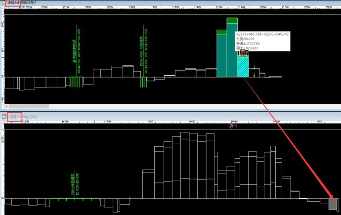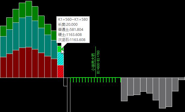 如下图3,该桥前后可跨越调配,绕行距离为20米。如下图4、图5所示,将K1+560~K1+580挖方土体调运至K1+760~K1+780填方段落,挖方土体重心为K1+570,填方土体重心为K1+770,两者之间距离为200米,再加绕行距离20米,其调配运距为220米。