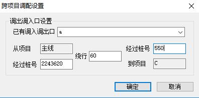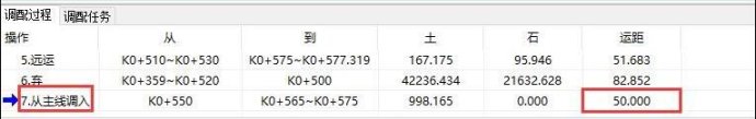 如下图6为跨项目调配界面,欲将主线K2243+495.724~K2243+545.743的挖方土体调运至C匝道K0+565~K0+575填方段落。设置跨项目调入调出口数据,如下图7,从主线经过其桩号K2243+620绕行60米,经过C匝道桩号K0+550到达填方目的地。