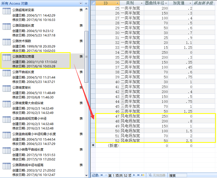 2.2打开公路路面加宽值表格,在表格最后面增加风电场道路对应的加宽值。其临界半径以及对应的加宽值均可根据需求去增加或者修改。