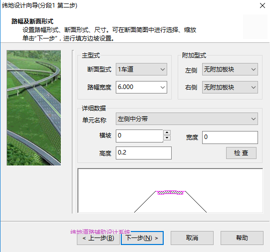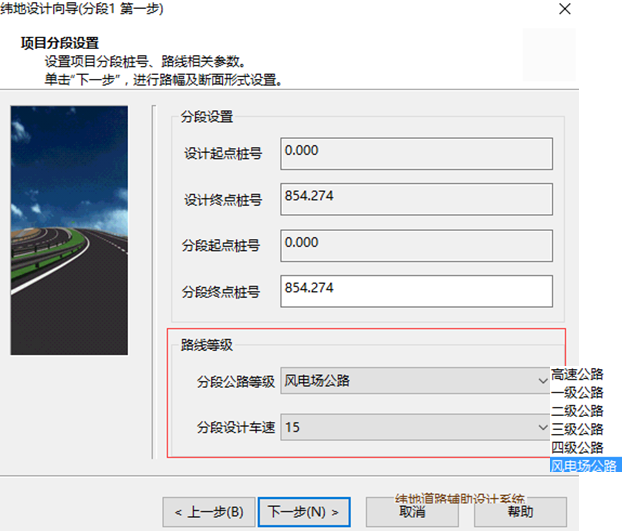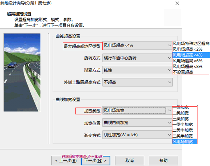 第三步、修改好指数指标表之后,即可打开软件,对等外路进行设计向导。例如,设计向导第一步,我们可以在道路等级中选择设置好的风电场道路等级,如图5,系统会自动显示风电场道路的设计速度。设计向导第二步,系统会自动调用风电场道路对应的路幅以及断面参数,如图6.接下来在超高加宽计算时,风电场道路对应的超高指标以及加宽形式也自动显示在软件界面上图7,根据需求选择即可.最后在计算超高时会根据设置好的超高渐变率进行计算。