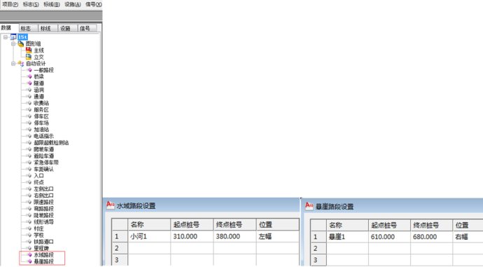 如果在路线项目的左右两侧路基边缘存在水域和悬崖的路段,就需要单独进行护栏设置。我们可以先在程序界面左侧的“数据”树形菜单下面,找到水域路段、悬崖路段,双击打开,即可添加水域、悬崖路段的名称、起终点桩号、位置等信息。