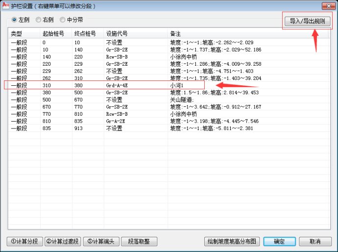 点击“护栏设置”右上角的“导出规则”命令,将我们之前自定义好的护栏自动布设规则保存起来,保存到*.hlr文件中。在下个项目设计时,可以点击“导入规则”,将之前设置好的护栏规则自动导入进来,不用再重复手工设置一遍了,可以大大提高我们的生产效率。