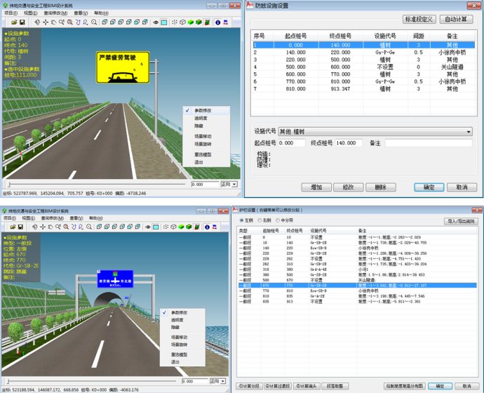 在我们进行护栏平面设计的同时,系统后台会自动生成护栏等所有安全设施的三维模型。我们可以打开BIM设计窗口,实时检查、浏览、修改护栏等其它安全设施的属性参数及其布设情况。在三维设计窗口,我们可以更加清楚准确的检查护栏、防眩设施、隔离栅、轮廓标等安全设施的布设情况,还可以在三维窗口选中相应的模型,点击鼠标右键“参数修改”,系统会自动切换到其对应的二维设计窗口,参数修改后,三维模型会自动在后台实时刷新并重新绘制。