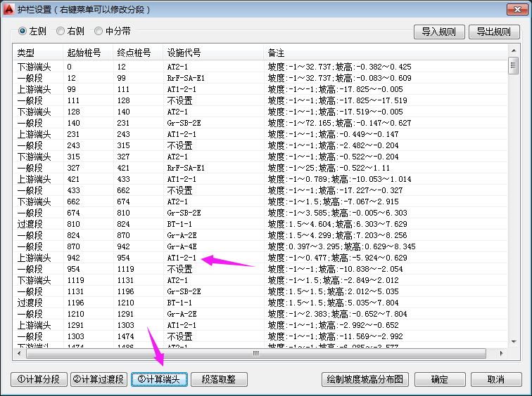 将各种先决条件都设置好之后,点击“①计算分段”就可以进行护栏自动布设了。