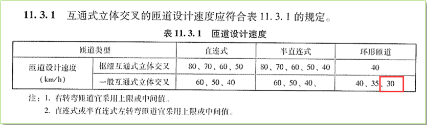 《规范》第13.5.4条明确U型“匝道的设计速度不宜低于20km/h”,而《规范》中关于立体交叉匝道的设计速度分档中,最低一档为30km/h。因此,一般U型转弯匝道的设计速度可按照30km/h对待。