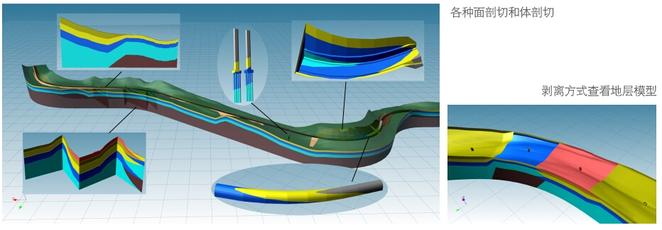系统提供了多种模型观察方式,可对模型进行任意角度的查看,并可进行多种方式的灵活剖切(任意面、纵横剖面、折线剖面、导入模型剖切、路基模型剖切、任意断面模型剖切等),可以直观查看地质体的内部构造,并可通过层层剥离方式查看各地层的相互关系。