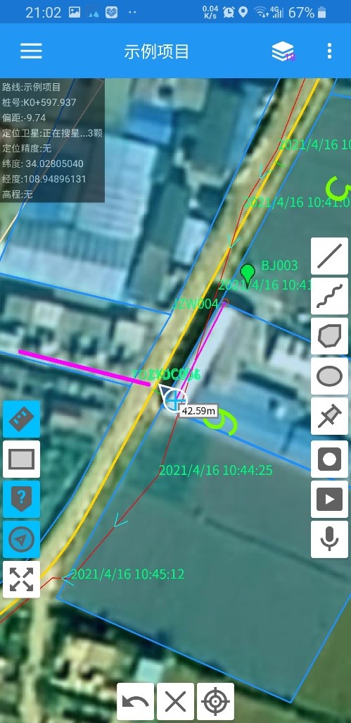 内置多种地图(天地图、百度地图、高德地图、Google地图),用户可根据需求随意切换。用户将初步线位导入纬地外业手簿移动端之后,打开纬地外业手薄中的定位功能,系统自动搜索定位卫星,在外业手薄的左上角会实时显示出路线的项目名称、桩号、偏距、定位卫星个数、定位精度、经纬度、高程等信息,当系统自动搜索到的定位卫星个数达到一定数量之后,用户即可使用高德地图、百度地图的导航功能,快速定位导航到用户在外业现场所标记的位置。并且可以实时记录外业调查过程中的行驶轨迹。还可以采用拍照、录音、录像等多媒体功能记录行程,并分享行程轨迹,具有户外助手APP的功能。