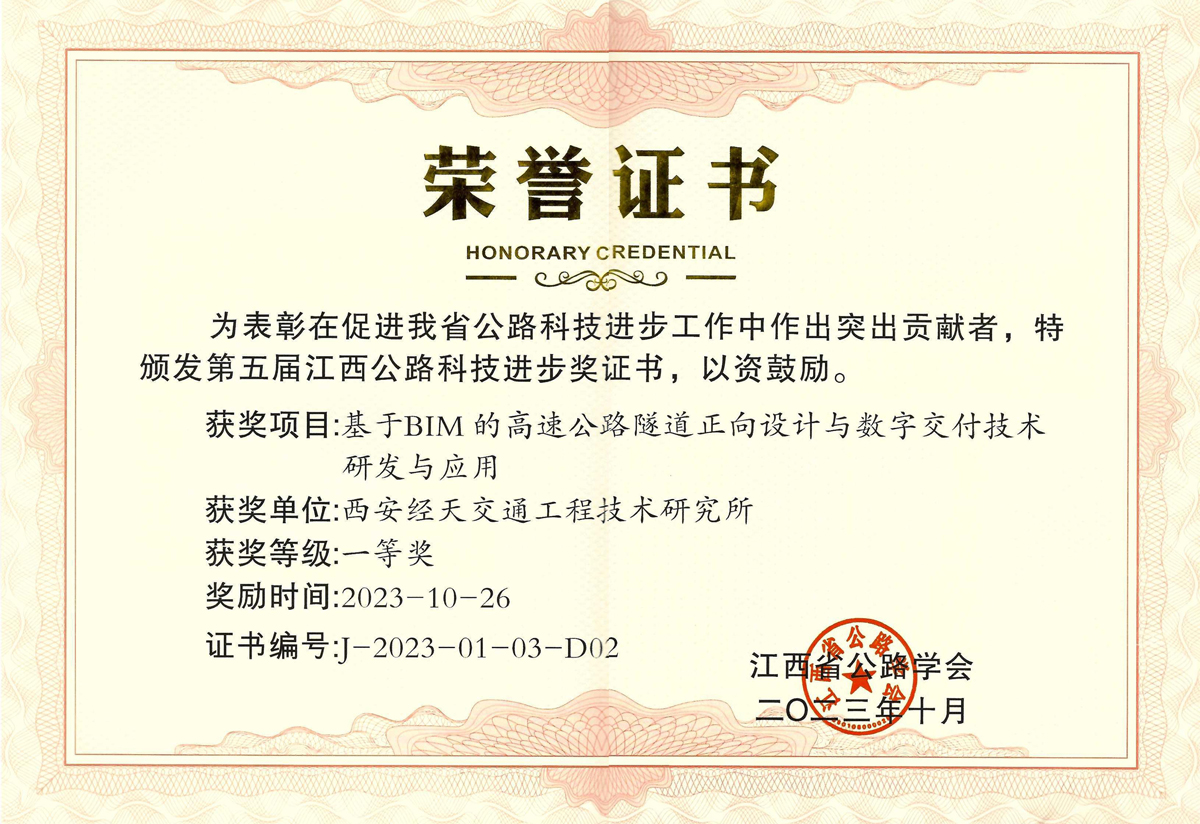 根据2023年10月26日江西省公路学会文件通知,由江西省公路科研设计院有限公司和我公司共同承担的“基于BIM的高速公路隧道正向……